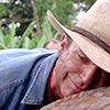 Description: close up on man in a straw hat hugging a dinosaur